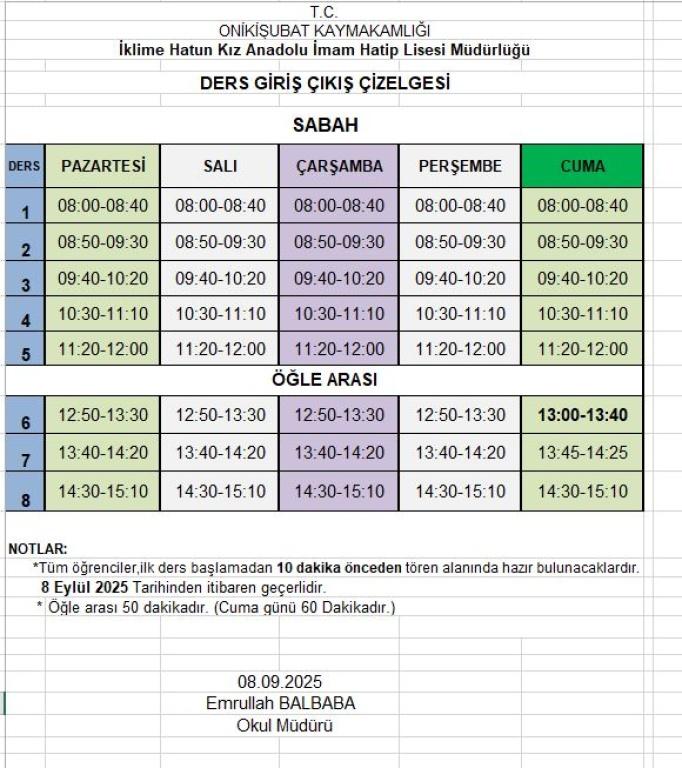 8 Eylül 2025 Pazartesi gününden itibaren giriş çıkış saatlerimiz aşağıdadır.
